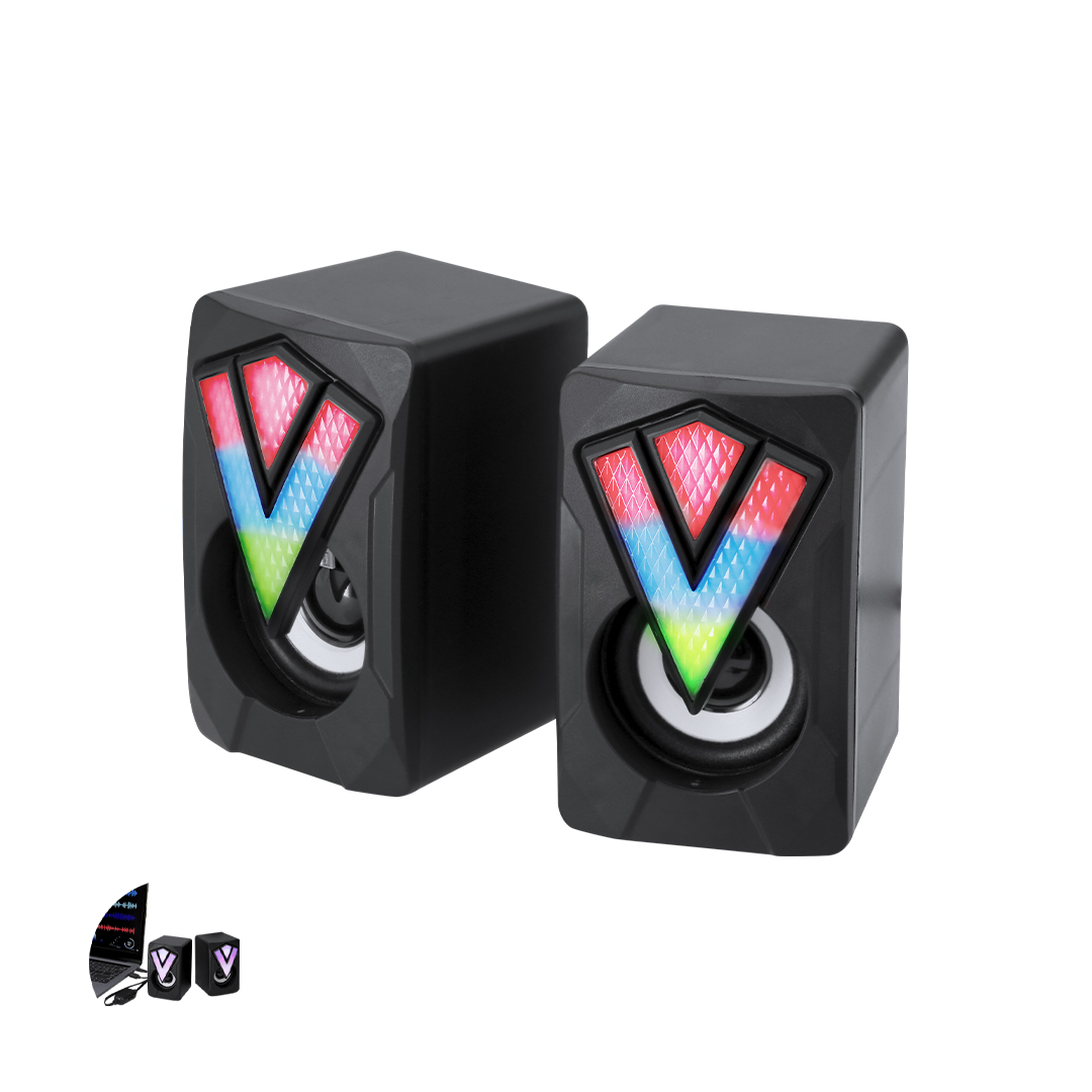 Altavoces gamer diseñados para una experiencia de juego inmersiva. Diseñados con carcasa en negro mate con luces LEDs multicolor y efectos de iluminación automáticos. Incluyen un cable integrado con regulador de volumen, conexión jack de 3,5 mm y alimentación a través de USB.