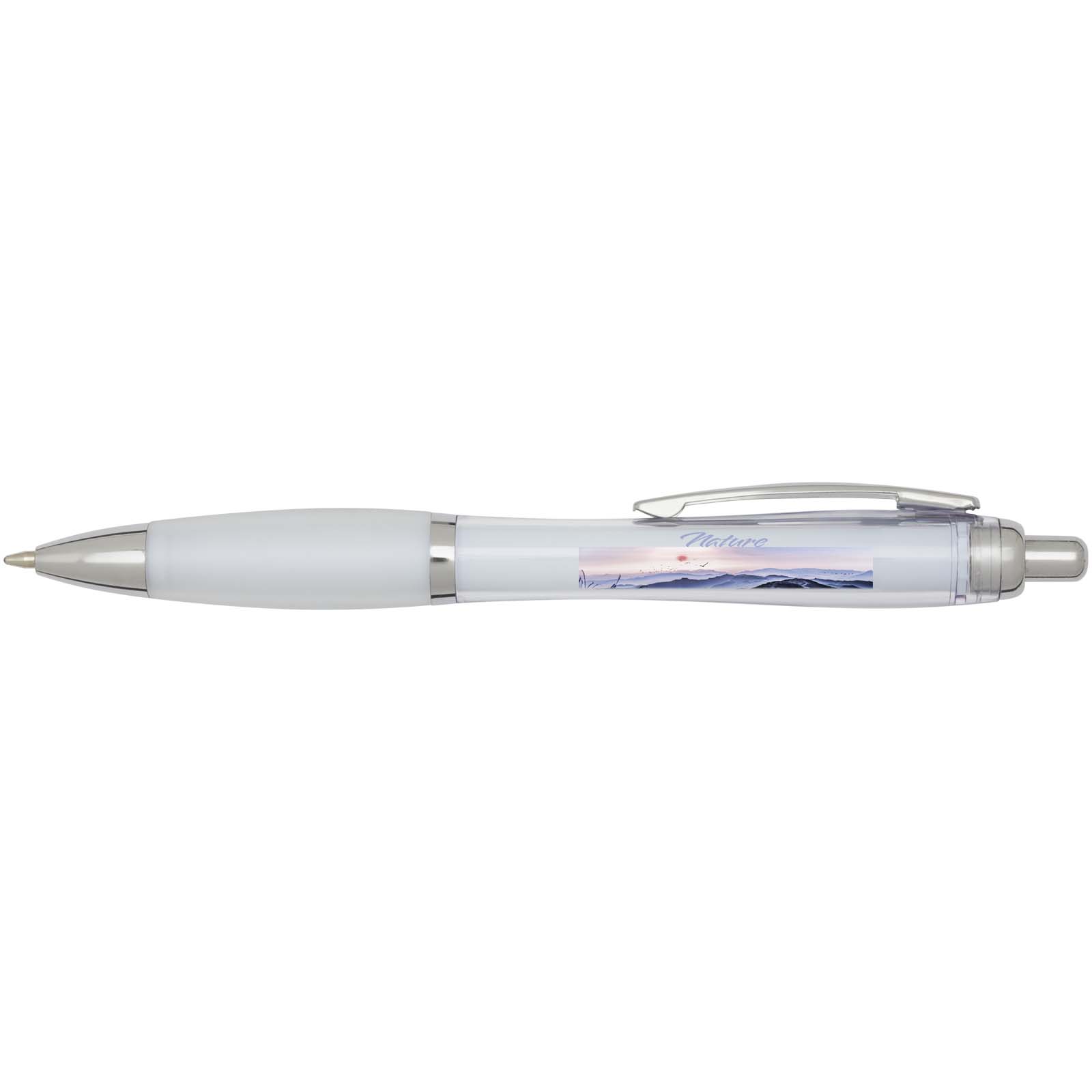 El bolígrafo "Nash" de plástico reciclado con mecanismo de clic presenta un elegante diseño curvado con cuerpo de color transparente y adornos plateados y una empuñadura blanda del mismo color para escribir con comodidad. Fabricado con plástico ABS reciclado con certificado RCS, ayuda a reducir el uso de materias primas y mantiene su durabilidad. En la parte trasera aparece el logotipo de rABS, que destaca su contenido reciclado. Color de la tinta: Azul. Tamaño de la punta: 1,0 mm. Longitud de escritura: 1000 metros.