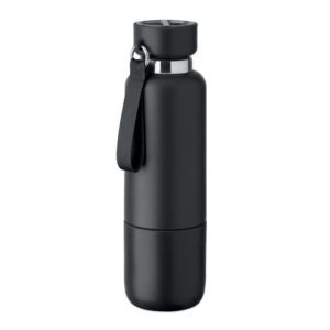 Botella de doble pared aislada al vacío de acero inoxidable reciclado (90% de acero inoxidable reciclado y 10% de acero inoxidable) con acabado de caucho y asa de silicona. Capacidad: 500 ml.