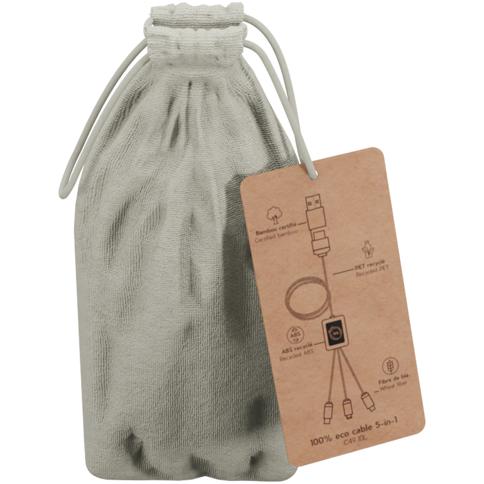 Cable de carga rápida de 2,4 A (3 x 10 cm) que se puede personalizar con logotipo retroiluminado en ambos lados, que también puede ser diferente entre un lado y el otro. Este cable está fabricado íntegramente con materiales más sostenibles: cordones de PET reciclado, bambú, fibras de trigo y plástico reciclado. El cable de carga está hecho para ser universal gracias a sus 3 salidas (tipo C, Android y iPhone) y puede cargar hasta tres dispositivos de manera simultánea. Gracias a su entrada doble USB y USB-C, es compatible con los cargadores más recientes. Se entrega en una funda de algodón (20 x 8 cm), con una tarjeta de papel kraft.