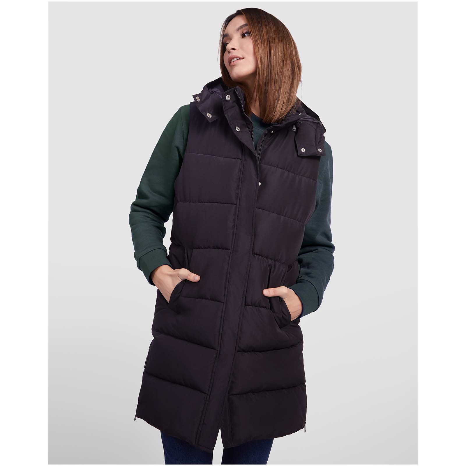 Chaleco acolchado con capucha desmontable. Cuello alto. Cierre frontal con cremallera oculta por solapa. Dos bolsillos con cierre de botón a presión. Aberturas laterales con cremalleras. Acceso a la parte interior del pecho. Repele el agua.