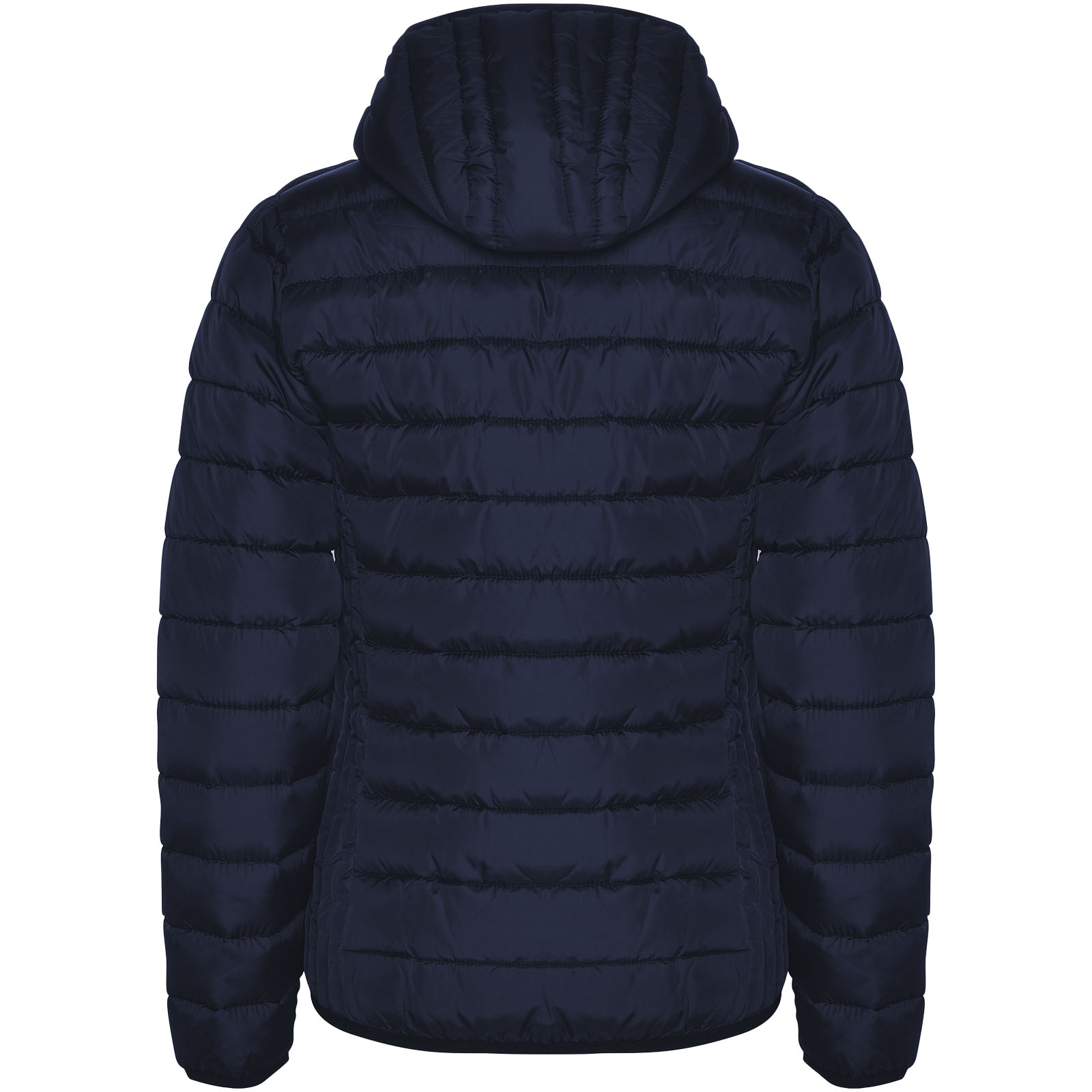 Chaqueta de mujer acolchada con relleno tacto pluma y capucha fija. Cremalleras invertidas con protector de barbilla a juego. Dos bolsillos laterales con cremallera. Ribete elástico a tono en puños, bajos y capucha. Forro interior a contraste. Prenda ligera y plegable. Resistente al agua. Modelo a prueba de viento.