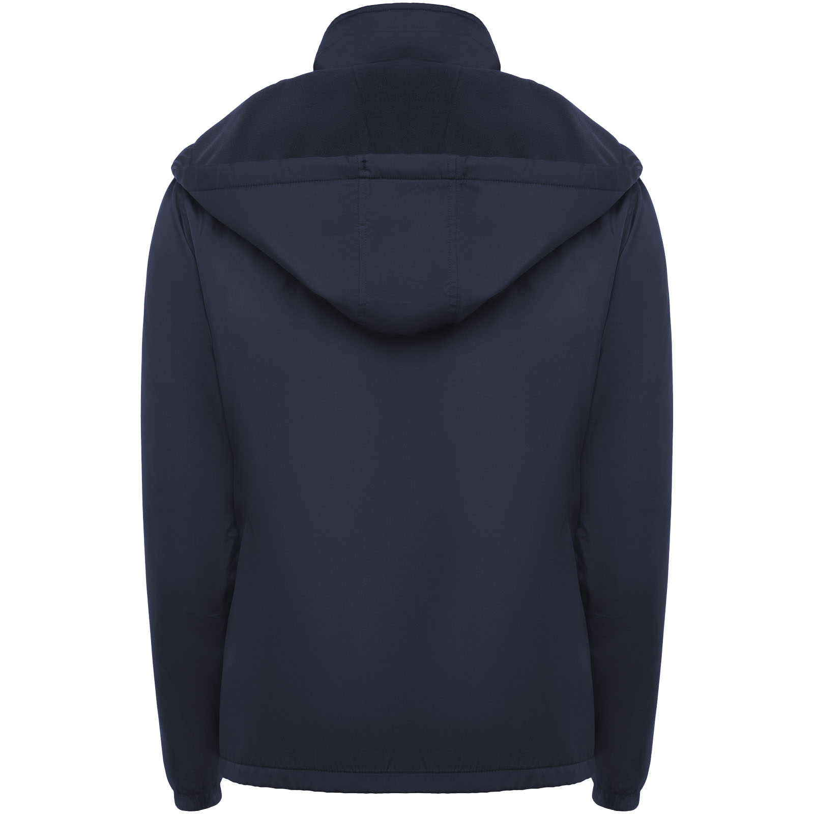 Chaqueta ligera repelente al agua. Cuello alto y capucha plegable con ajustadores. Forro interior micropolar. Cremallera frontal y protector de barbilla. Puños elásticos. Dos bolsillos laterales con cremallera. Bolsillo interior en pecho izquierdo. Etiqueta extraíble. Resistente al agua. A prueba de viento. El modelo masculino mide 184 cms y lleva la talla L, y la modelo femenina mide 174 cms y lleva la talla S.