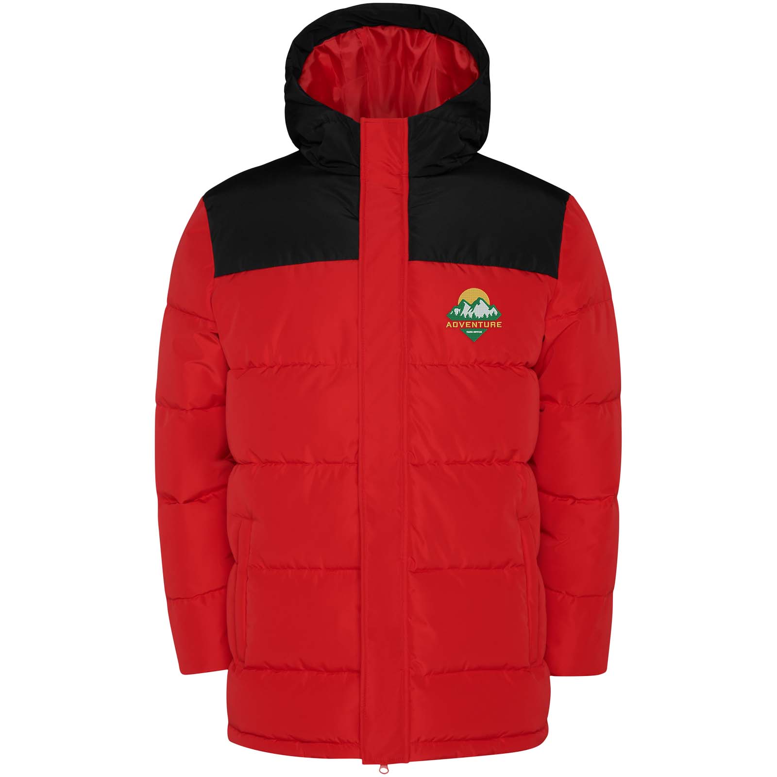 Chaqueta acolchada con capucha fija. Cremallera frontal cubierta con tapeta. Protector de barbilla. Dos bolsillos laterales con cremallera. Bajos ajustados elásticos.