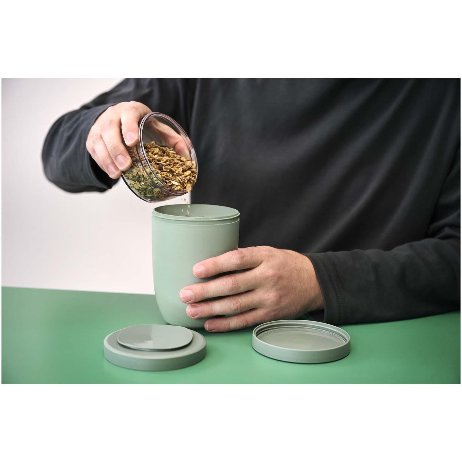 Fiambrera con aislamiento y dos compartimentos independientes para mantener los ingredientes perfectamente separados. Cada recipiente tiene su propia tapa para evitar que se mezclen, por lo que es ideal para comidas con aderezos, guarniciones o salsas. Mantiene la comida caliente durante 6-8 horas y fría hasta 12 horas. El recipiente superior transparente tiene una capacidad de 300 ml, mientras que el inferior puede contener 750 ml. Fabricada con materiales duraderos, el exterior se mantiene fresco y seco al tacto. Se recomienda lavar a mano, aunque los componentes de plástico de la tapa son aptos para lavavajillas. Sin BPA.