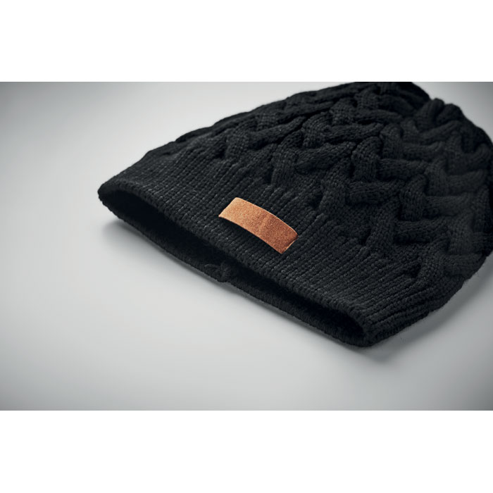 Gorro de punto en RPET con etiqueta para el área de impresión.