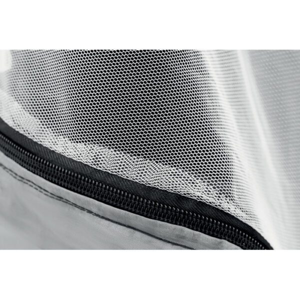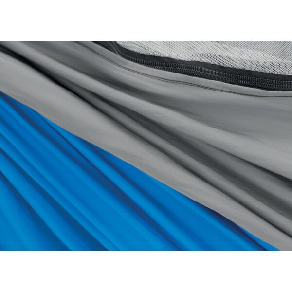 Hamaca con mosquitera integrada. Hecha de nylon resistente y ligero. Para un montaje fácil, se incluyen la correa y los mosquetones. Esta hamaca puede soportar hasta 200 kg.