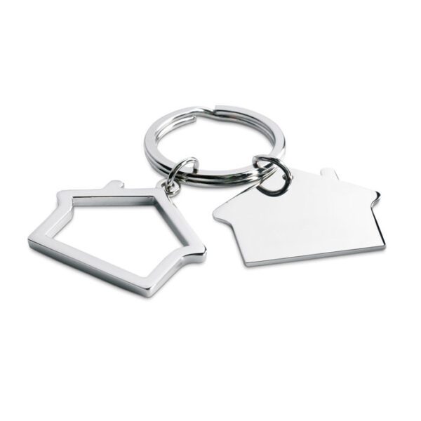 Llavero de metal en forma de casa. Presentado en caja de regalo individual de color blanco.
