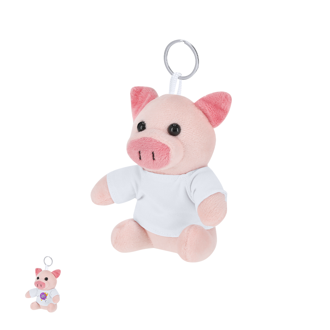 Llavero cerdito de peluche con camiseta personalizable con anilla metálica para fácil transporte, ideal para sublimación.