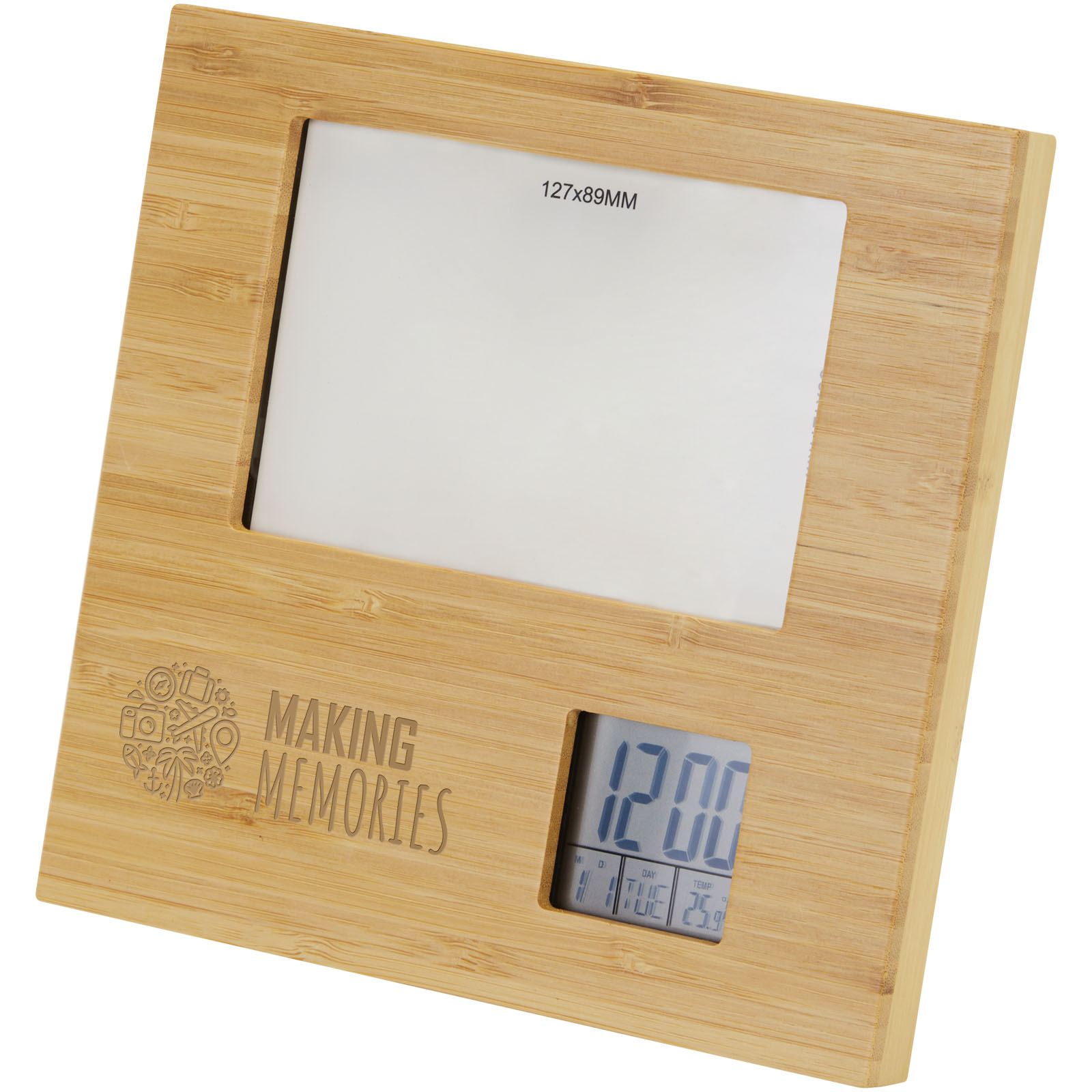 El marco de fotos de bambú Sasa proporciona un complemento elegante y funcional para su hogar u oficina. Con la carcasa principal de bambú obtenido de forma responsable y la carcasa trasera de plástico reciclado, este marco de fotos irradia elegancia natural al tiempo que promueve la sostenibilidad. El marco tiene cristal LCD que garantiza una visualización clara y nítida de la hora, el mes, la fecha, el día de la semana y la temperatura en modo normal. También cuenta con una función de alarma/repetición para ayudarte a comenzar el día a tiempo. El modo de recordatorio de cumpleaños le permite realizar un seguimiento de fechas importantes, mientras que el modo de temporizador es perfecto para cronometrar tareas o actividades. Además, el modo de apreciación musical ofrece una selección de hasta 7 canciones opcionales para su disfrute. El tamaño de la ventana fotográfica es de 127 x 89 mm. Incluye 2 pilas AA. Se entrega con caja de regalo de papel kraft y manual de instrucciones.
