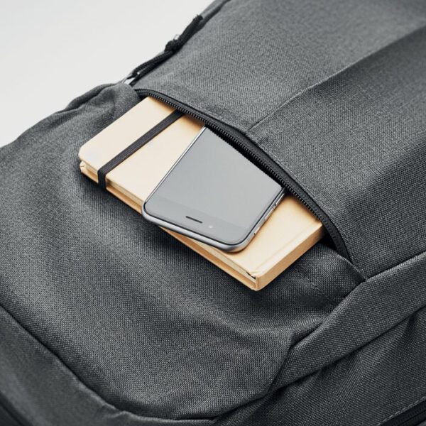 Mochila en poliéster 600D RPET jaspeada con bolsillo exterior con cremallera y bolsillo lateral de malla.