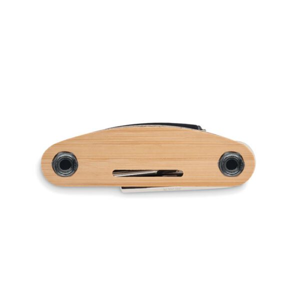 Herramienta de bolsillo multifunción de acero inoxidable con funda de bambú. 11 funciones. Incluye: llaves hexagonales, llave plana , alargador, destornillador Phillips y llave de vaso.