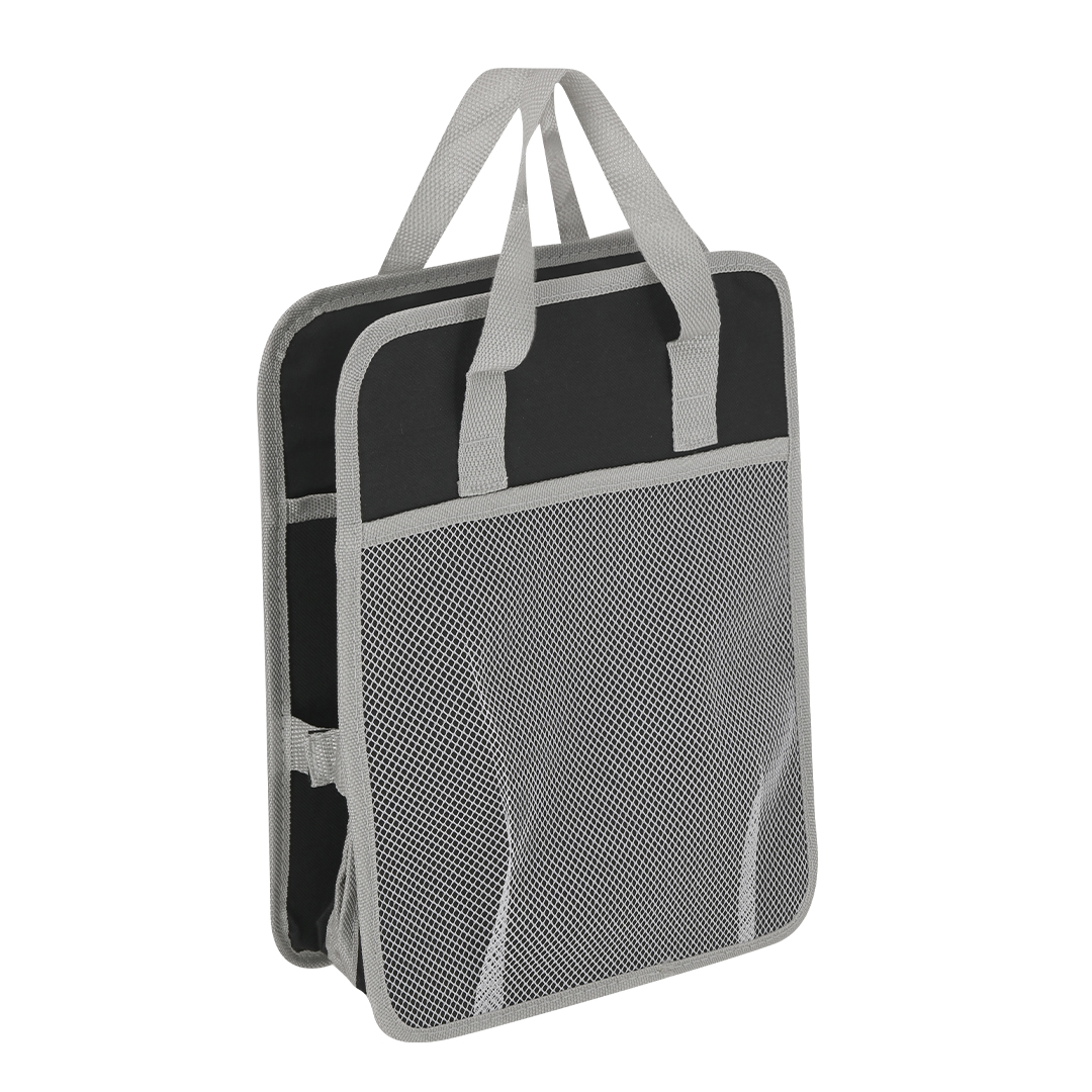 Organizador plegable fabricado en poliéster RPET 600D. Ideal para el maletero del coche. Con asas de transporte reforzadas, bolsillo frontal de malla en color gris y cintas en los laterales de velcro para mejor ajuste. Interior con tres compartimentos de almacenaje. El material RPET se elabora a partir de plástico reciclado, para así fomentar la reutilización de residuos plásticos y ayudar a la sostenibilidad del planeta.