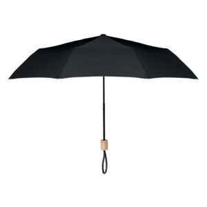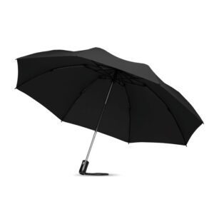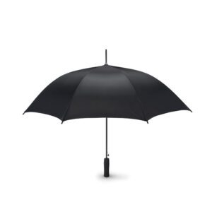 Paraguas de 23'' antiviento y de apertura automática en pongee 190T con diseño interior a cuadros. Estructura de fibra de vidrio con eje chapado en negro y puntas de plástico. Mango curvado acabado en goma. Cierre manual.