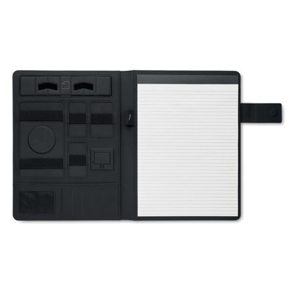 Portadocumentos A4 con funda de lino-PU. Power bank de 5000 mAh y cargador inalámbrico magnético de 15W. Bloc de notas de 20 hojas rayadas. Múltiples compartimentos internos. Cierre magnético. Portabolígrafos elástico.