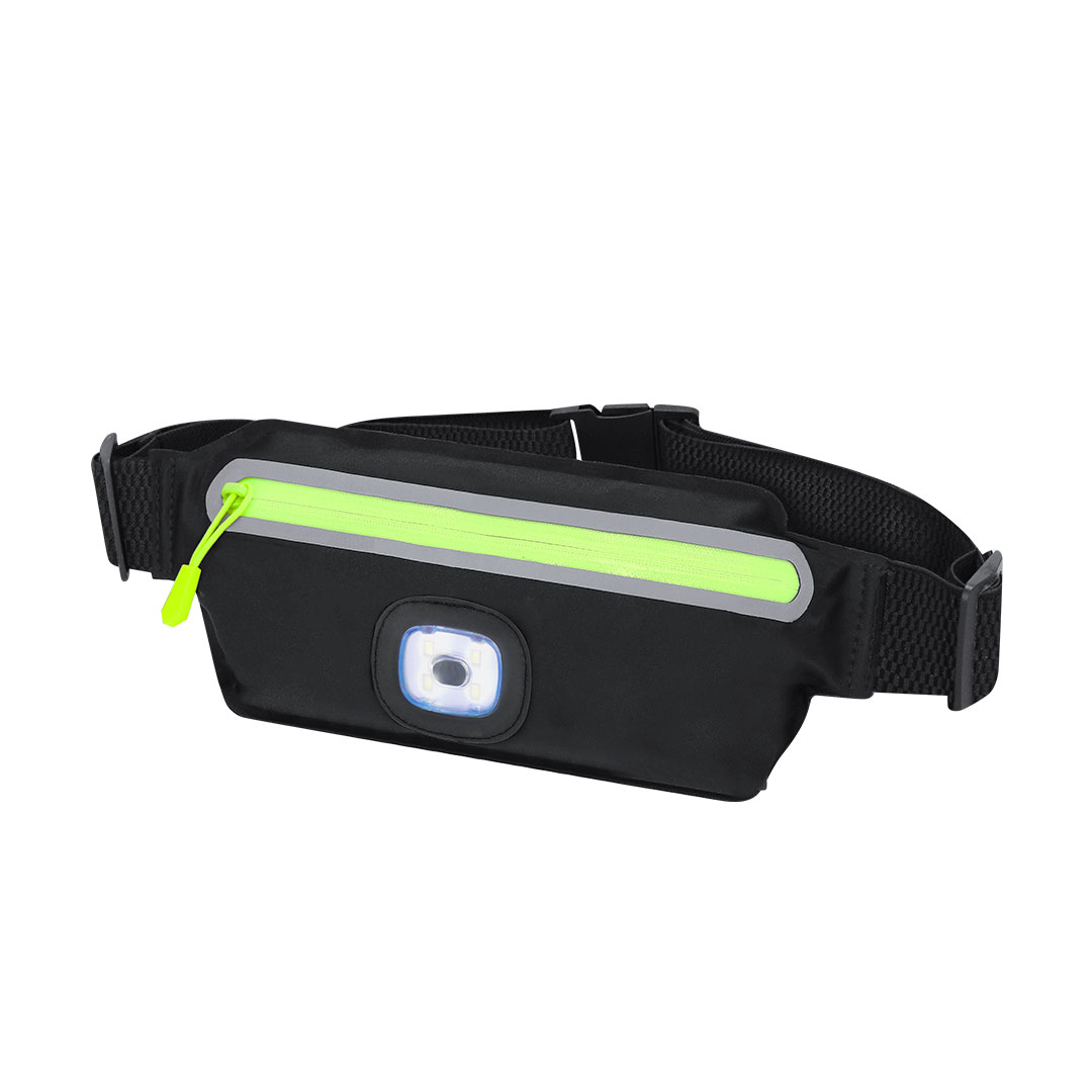 Riñonera fabricada en resistente poliéster. Compartimento principal con cierre de cremallera reflectante. En la parte frontal incluye una linterna con 3 intensidades de luz. Bateria de 300mAh, con carga a través de cable USB. Con cierre de hebilla y cinta ajustable, especialmente diseñada para actividades deportivas y de ocio.