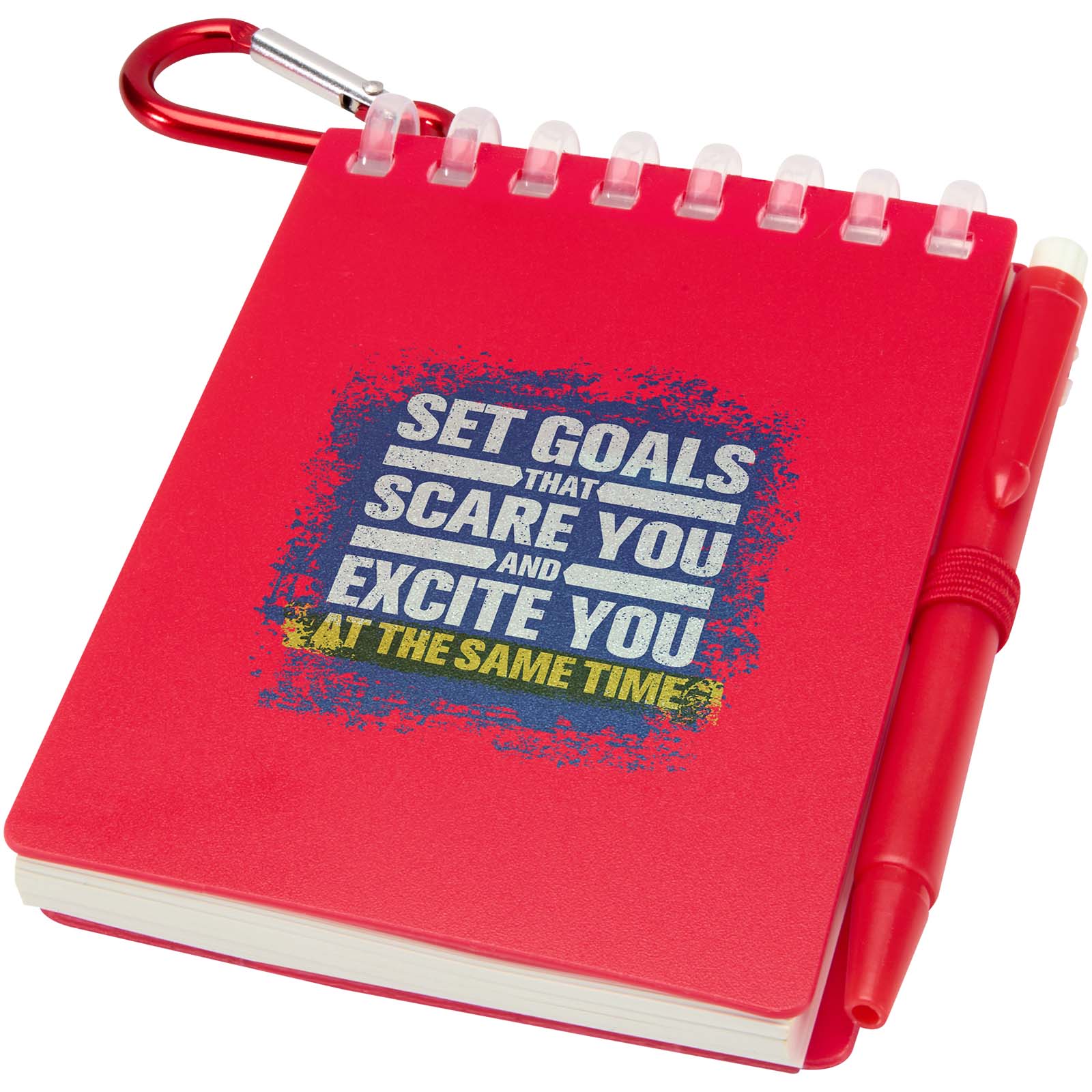 El conjunto "Lig" de pequeña libreta y bolígrafo es un accesorio compacto y práctico para tomar notas cuando estás fuera. La libreta encuadernada en espiral tiene una suave tapa de plástico reciclado y 70 hojas en blanco de papel de piedra resistente al agua de 120 g/m², lo que la hace ideal para su uso en exteriores. Con esquinas redondeadas y un soporte para bolígrafo integrado, tiene un moderno tamaño reducido sin dejar de ser funcional. El bolígrafo a juego está fabricado en plástico ABS reciclado, escribe con tinta negra y ofrece una longitud de escritura de 250 metros. Una anilla metálica de color a juego permite sujetarlo fácilmente a una mochila, un bolso o un llavero, lo que lo hace perfecto para tomar notas de forma duradera y portátil. Tamaño de la libreta: 11 x 7,5 cm.