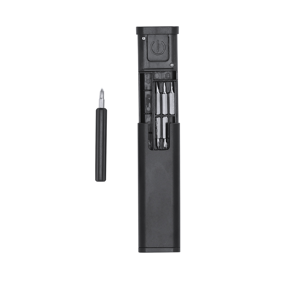 Set de herramientas fabricado en Aluminio Reciclado. Con función 2 en 1; estuche con forma de linterna de 4LEDs, con interior de almacenamiento de 6 herramientas; mango multifunción para cabezales compatibles de estrella y planos. Incluye práctico clip para llevarlo siempre contigo. Pilas a botón incluidas.