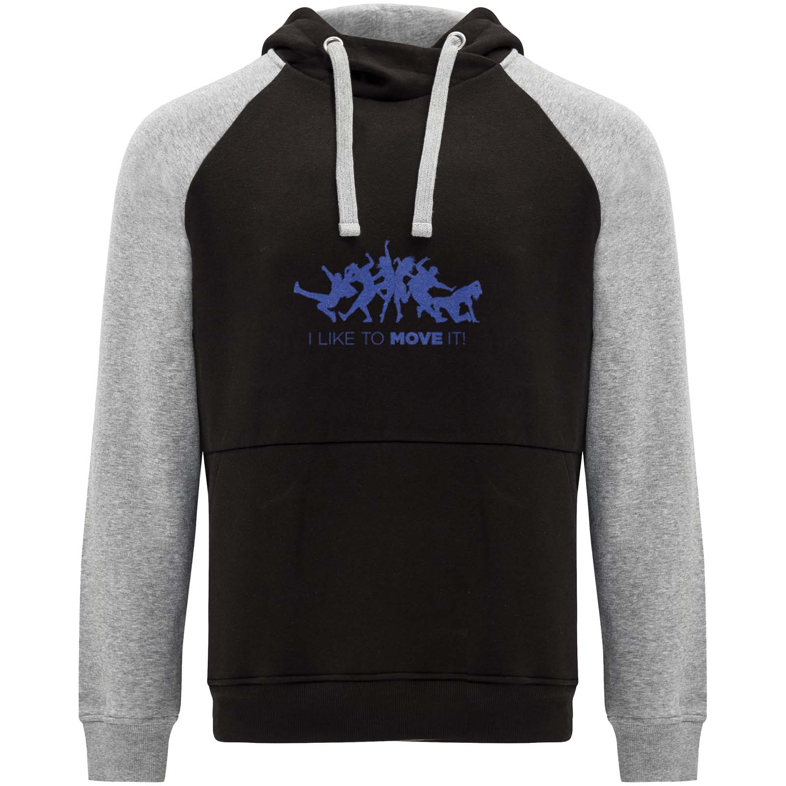 Sudadera con capucha bicolor unisex. Capucha con cuello cruzado y ojales metálicos. Interior de la capucha, cordón de ajuste y mangas raglán en contraste. Bolsillo tipo canguro. Puños y dobladillo de punto de elastano 1× 1. Etiqueta extraíble.