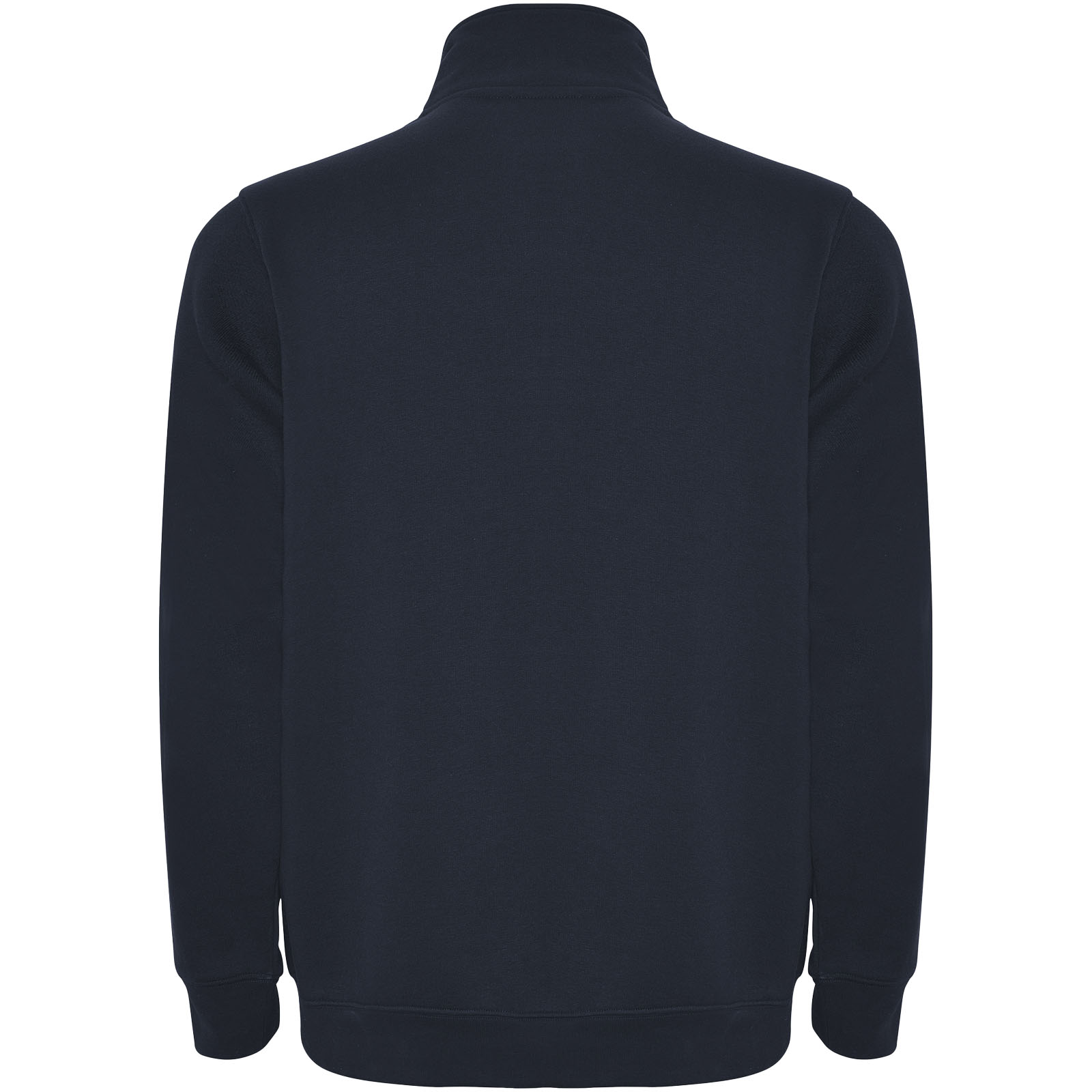 Sudadera con media cremallera a juego y cuello alto. Cuello interior en el mismo tono. Cubrecosturas reforzado en el interior del cuello. Punto canalé 1x1 en puños y cintura. El modelo mide 185 cms y lleva la talla M.