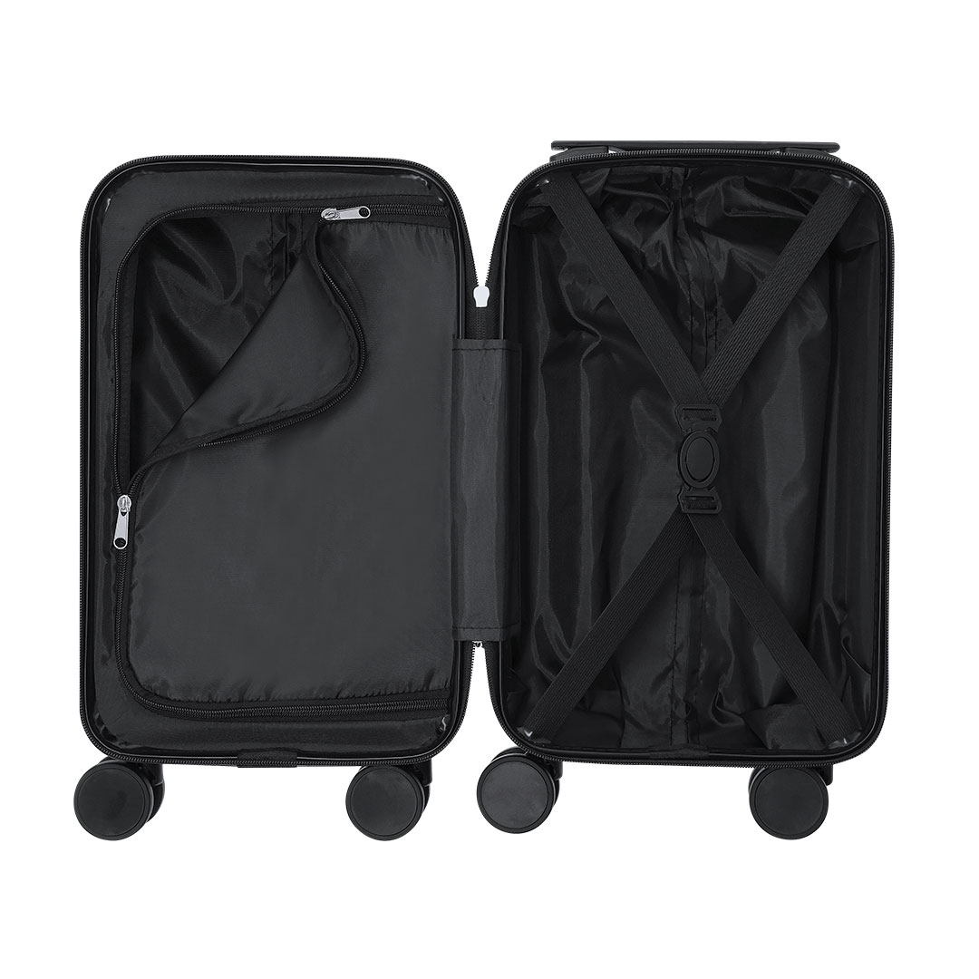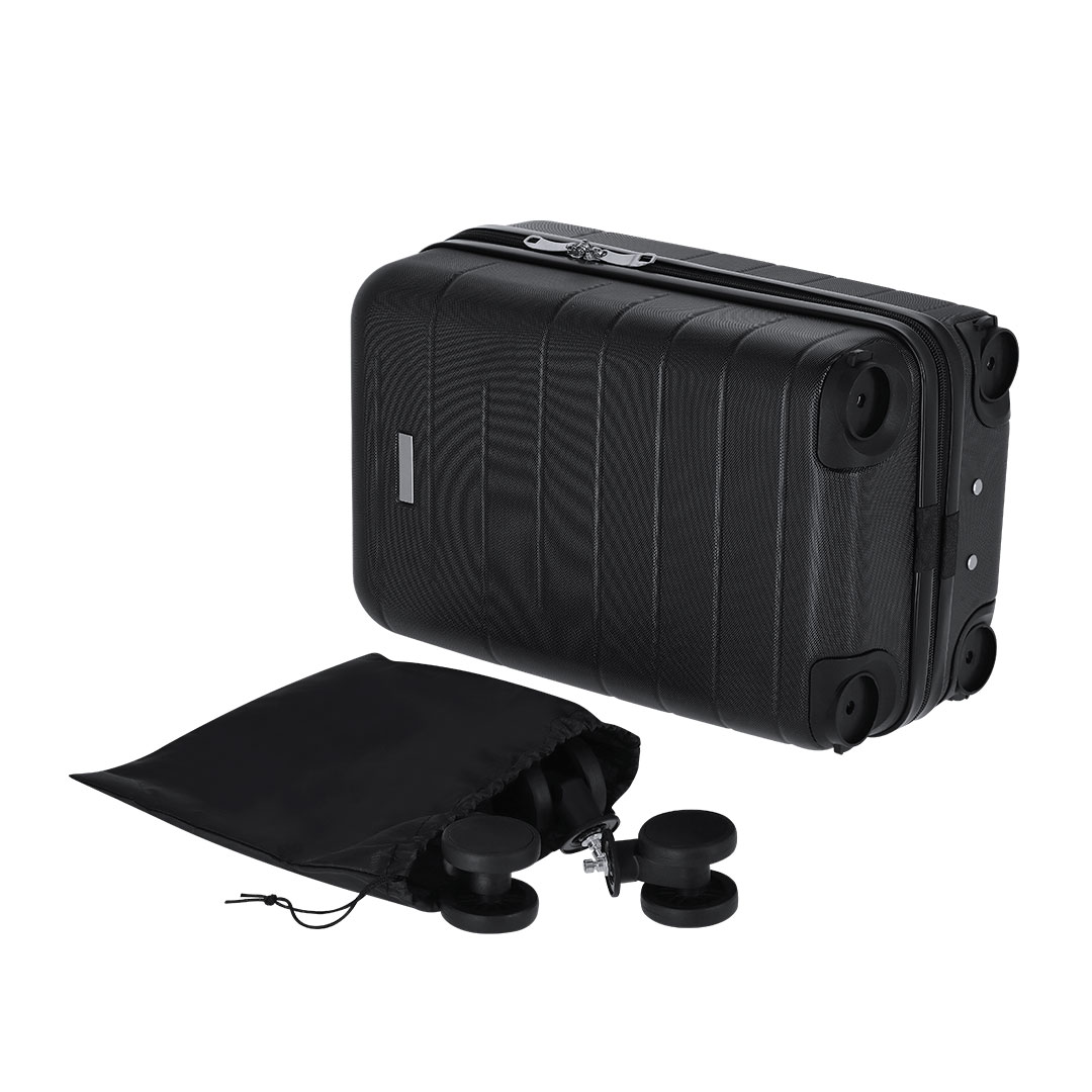Práctico trolley de 4 ruedas giratorias extraíbles, en rígido ABS. Cierre de cremallera de doble tirador. Interior con compartimentos y diversos. Gracias a su tamaño compacto y a la extracción de las ruedas llevar un trolley como equipaje de manos no será un problema. Incluye bolsa para guardar las ruedas.